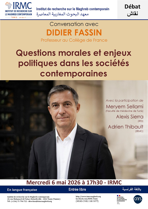 L’IRMC accueille, le 6 mai 2026 à 17h30, le Professeur au Collège de France, Didier Fassin, pour un débat autour des « Questions morales et enjeux politiques dans les sociétés contemporaines », avec la participattion de Adrien Thibault, politiste et sociologue (IRMC), Meryem Sellami, socio-anthropologue (Faculté de médecine de Tunis) et Alexis Sierra, géographe, représentant de l’IRD à Tunis.